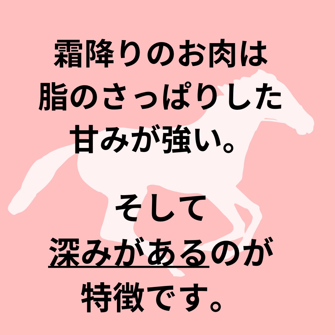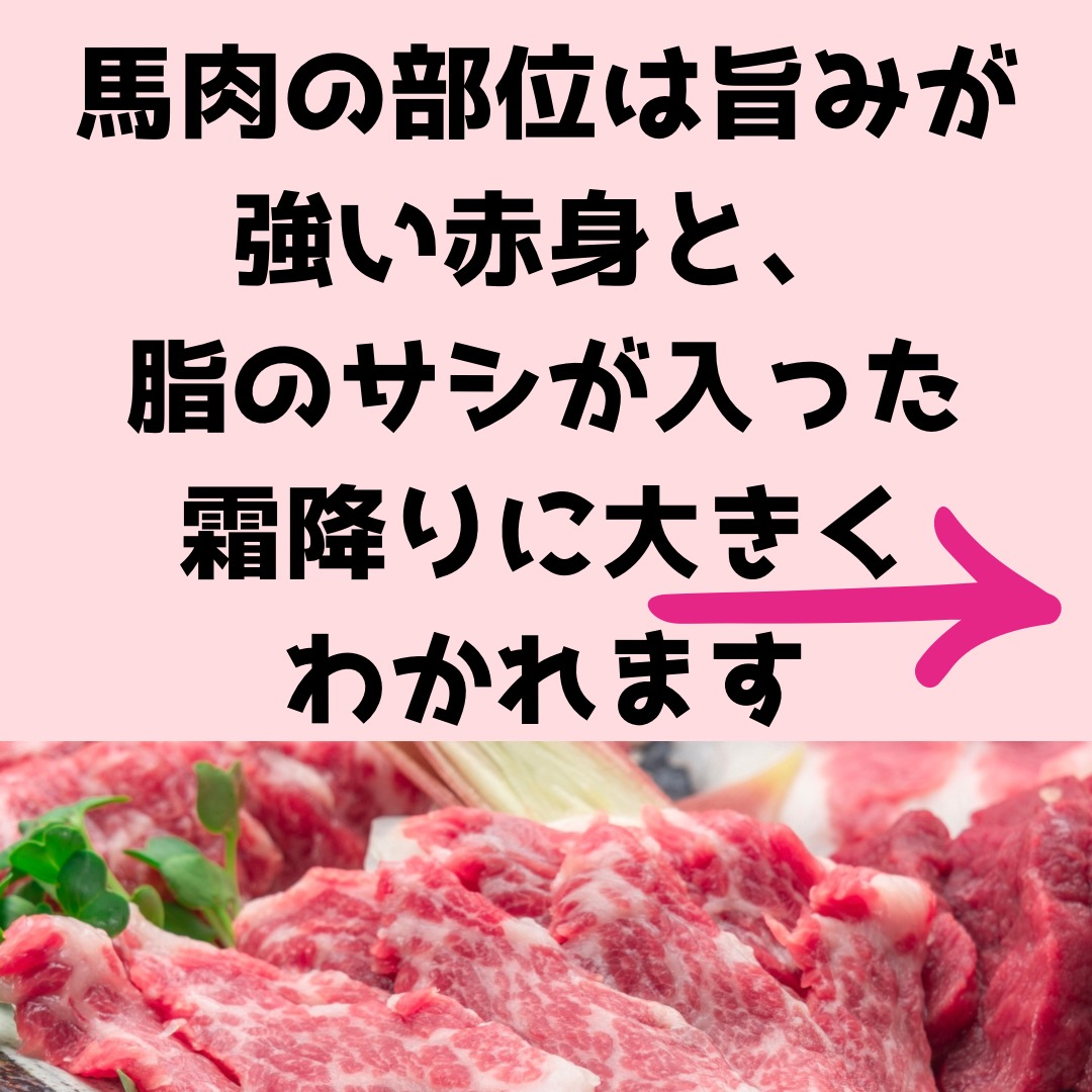 馬肉の部位は旨みが強い赤身と、脂のサシが入った霜降りに大きく分かれます。