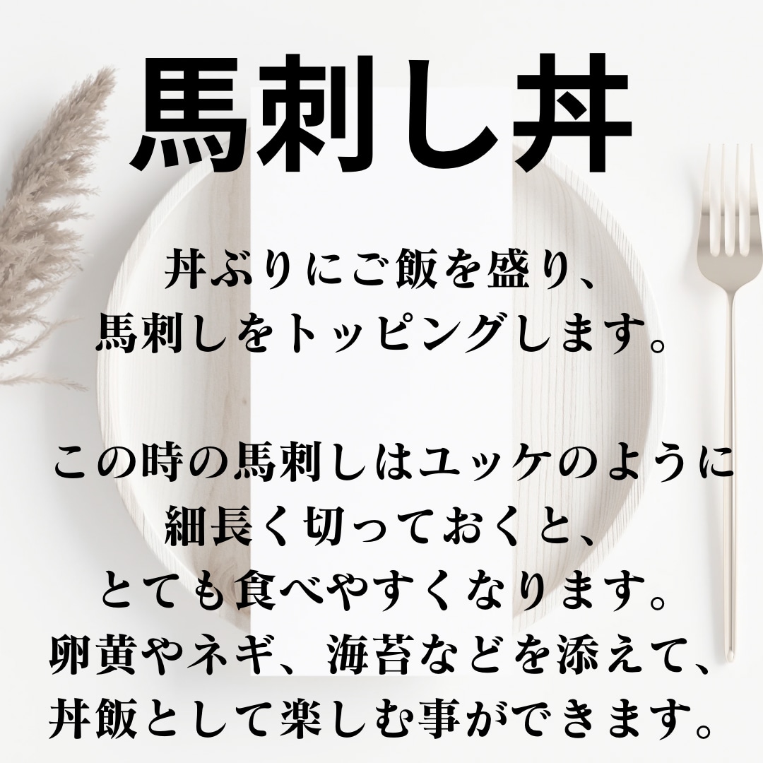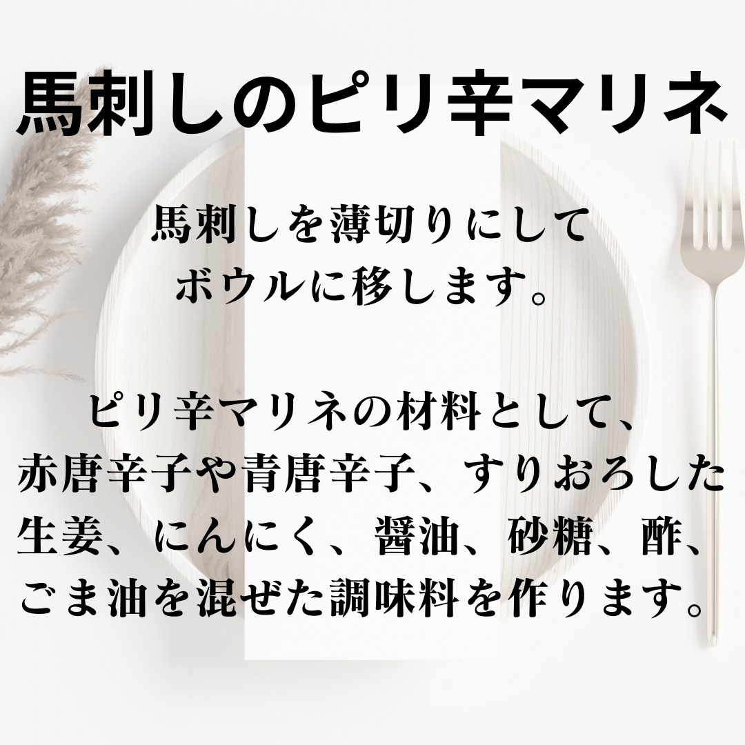 この時の馬刺しはユッケのように細長く切っておくと、とても食べやすくなります。