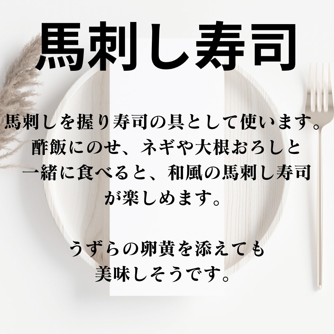 酢飯にのせ、ネギや大根おろしと一緒に食べると、和風の馬刺し寿司が楽しめます。