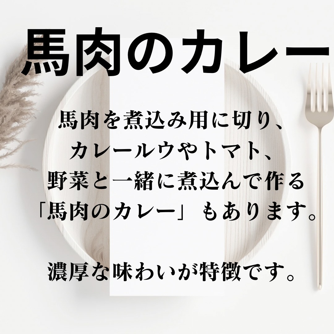 カレールウやトマト、野菜と一緒に煮込で作る「馬肉のカレー」です。