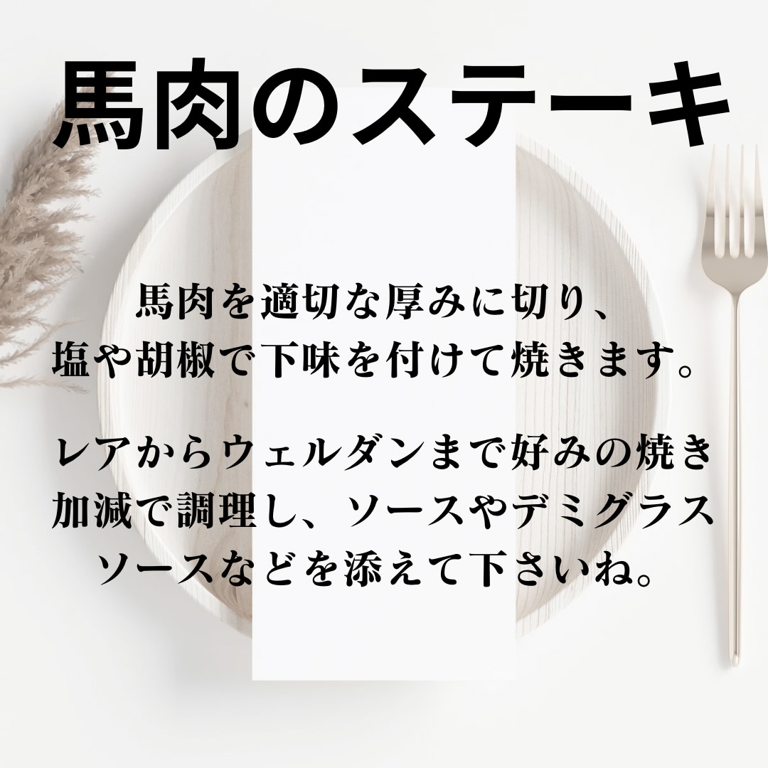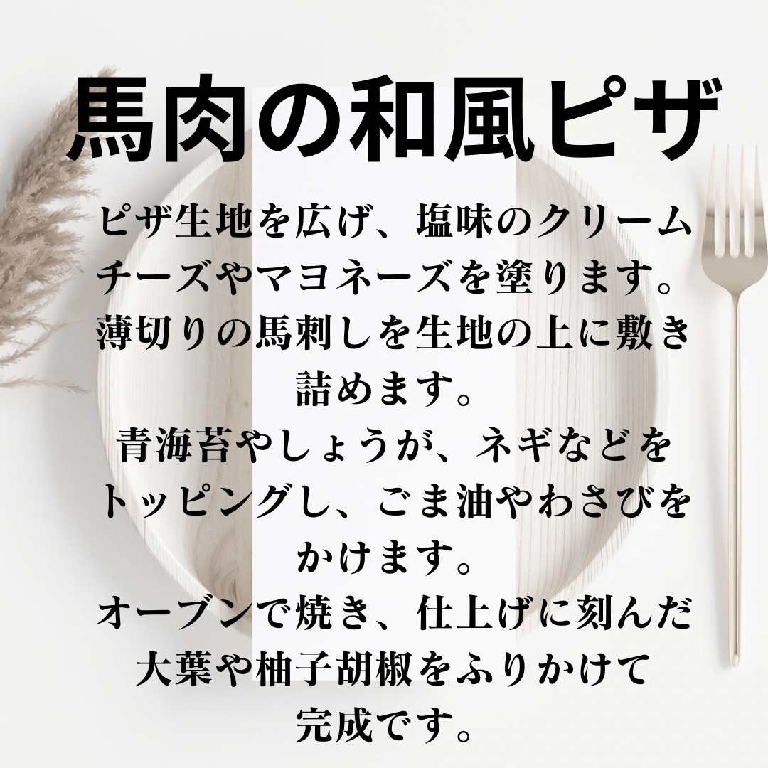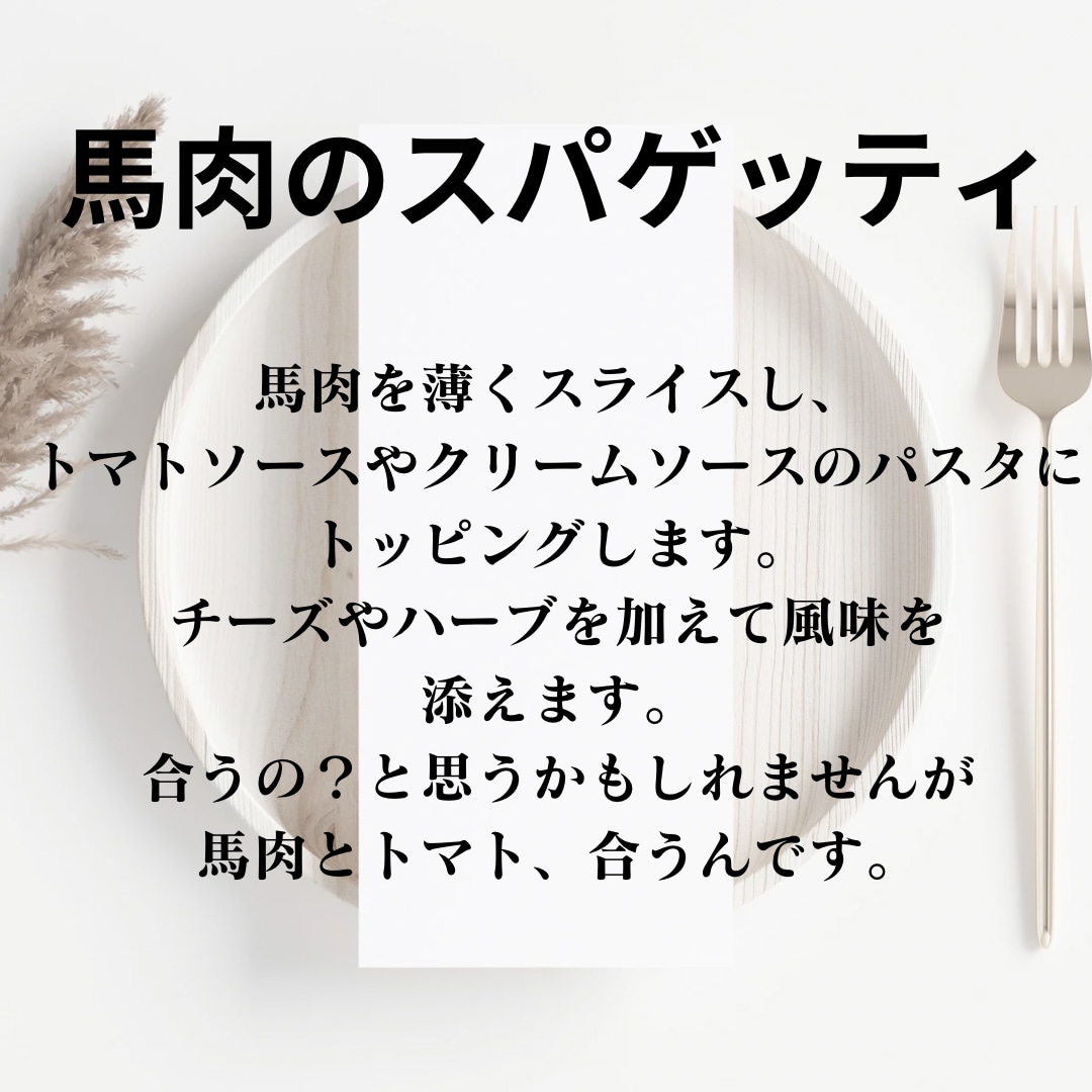 馬肉を薄くスライスし、トマトソースやクリームソースのパスタにトッピングします。