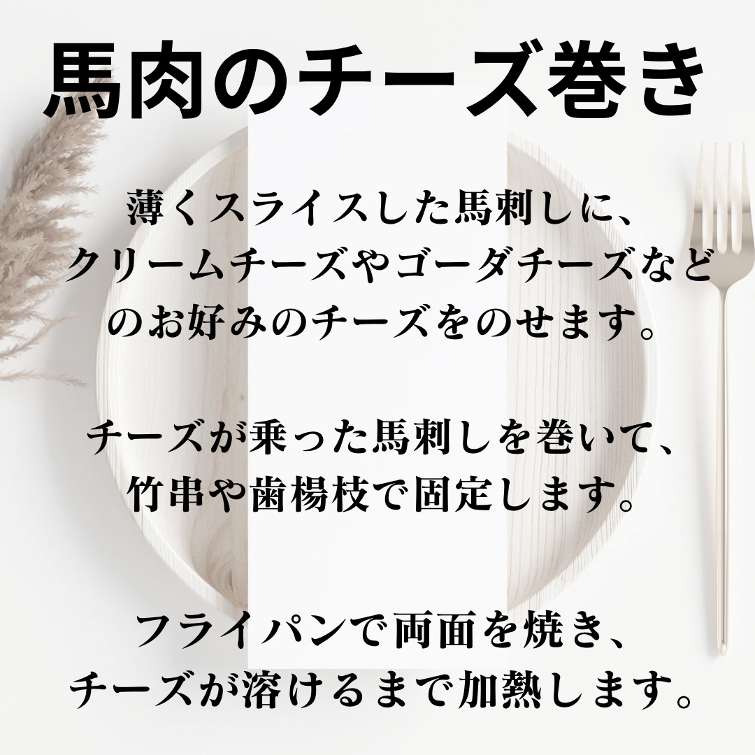 薄くスライスした馬刺しにクリームチーズやゴーダチーズなどのお好みのチーズを乗せます。