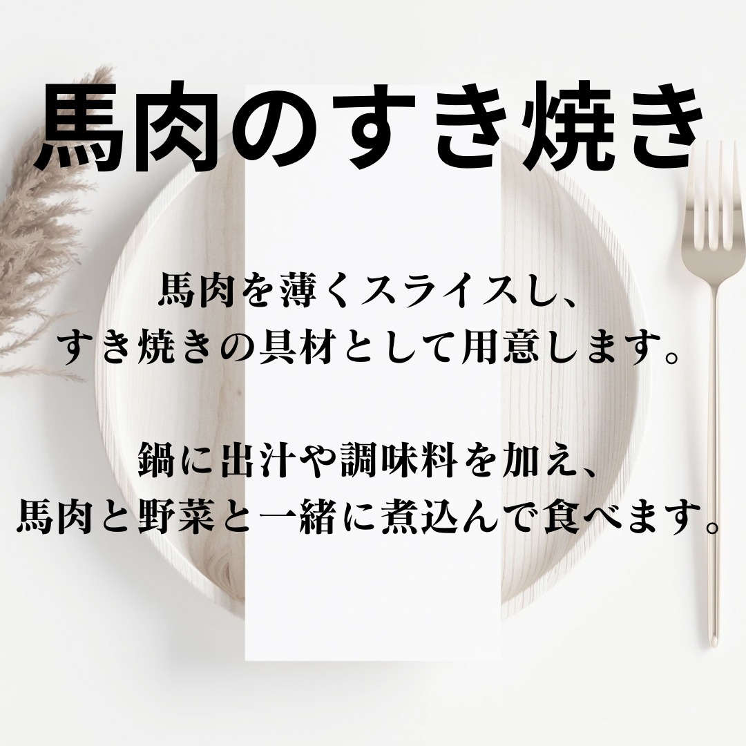 馬肉を薄くスライスし、すき焼きの具材として用意します。鍋に出汁や調味料を加え、馬肉と野菜を一緒に煮込んで食べます。