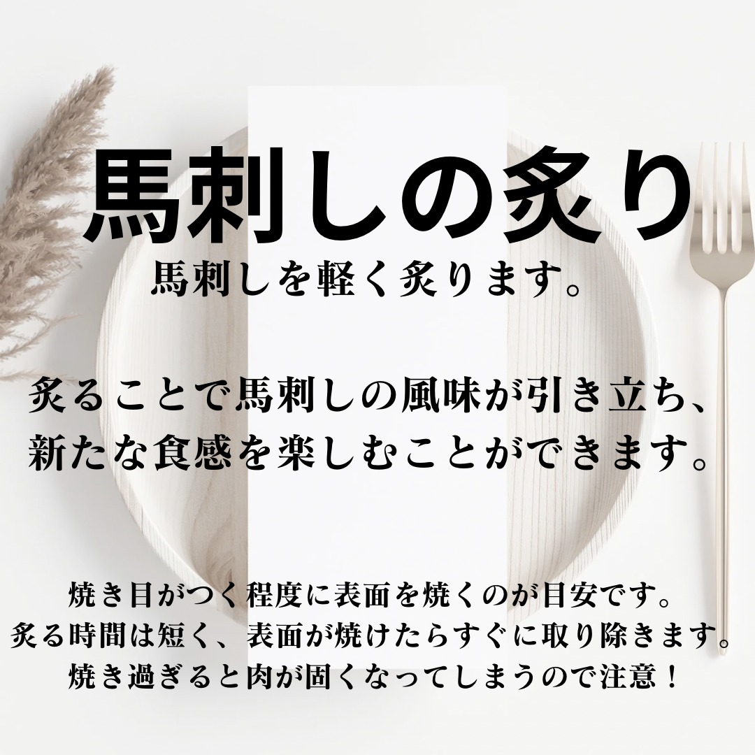炙ることで馬刺しの風味が引き立ち、新たな食感を楽しむことができます。
