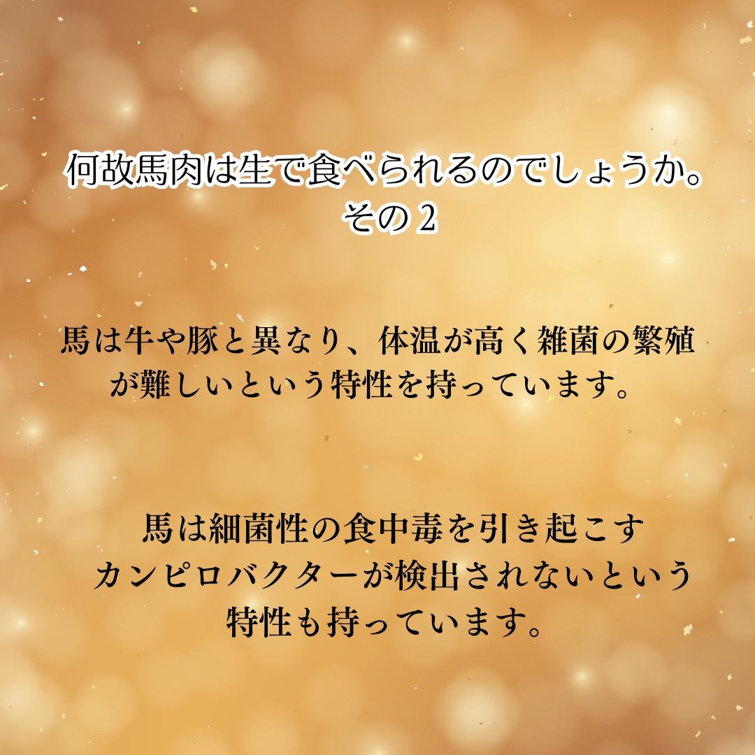 ②馬は牛や豚と異なり、体温が高く雑菌の繁殖が難しいという特性を持っています。