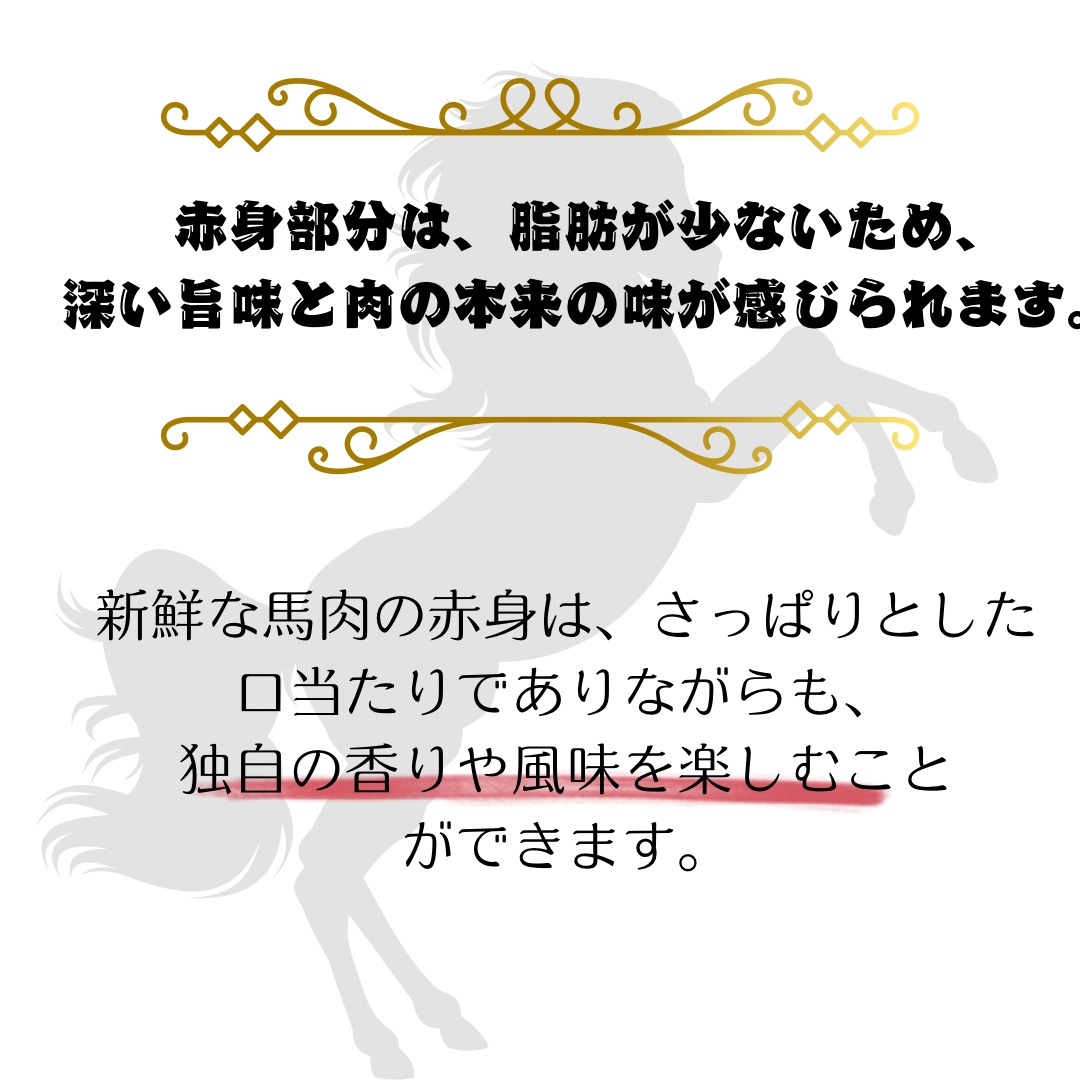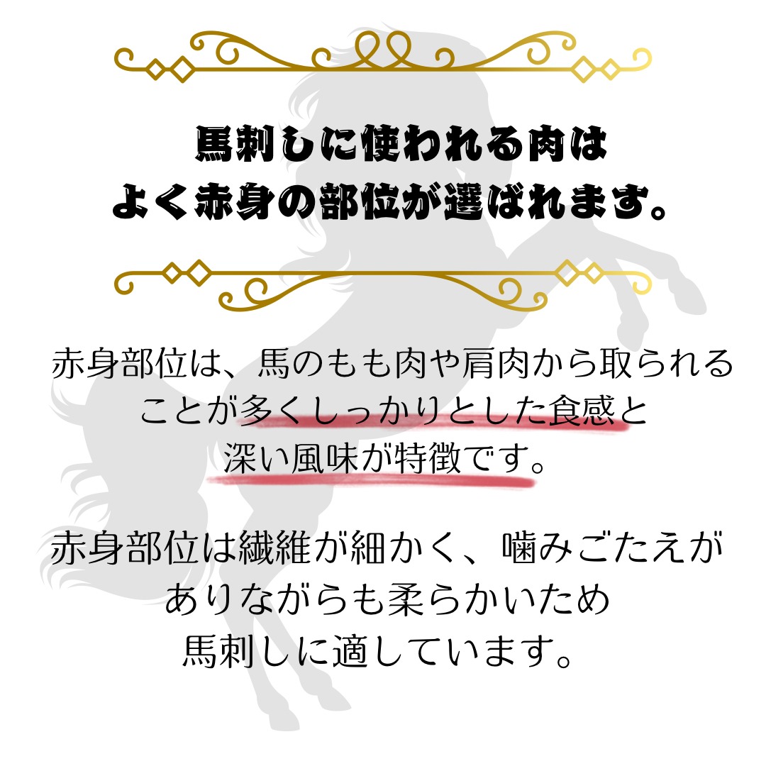 赤身部位は繊維が細かく、噛みごたえがありながらも柔らかいため、馬刺しに適しています。