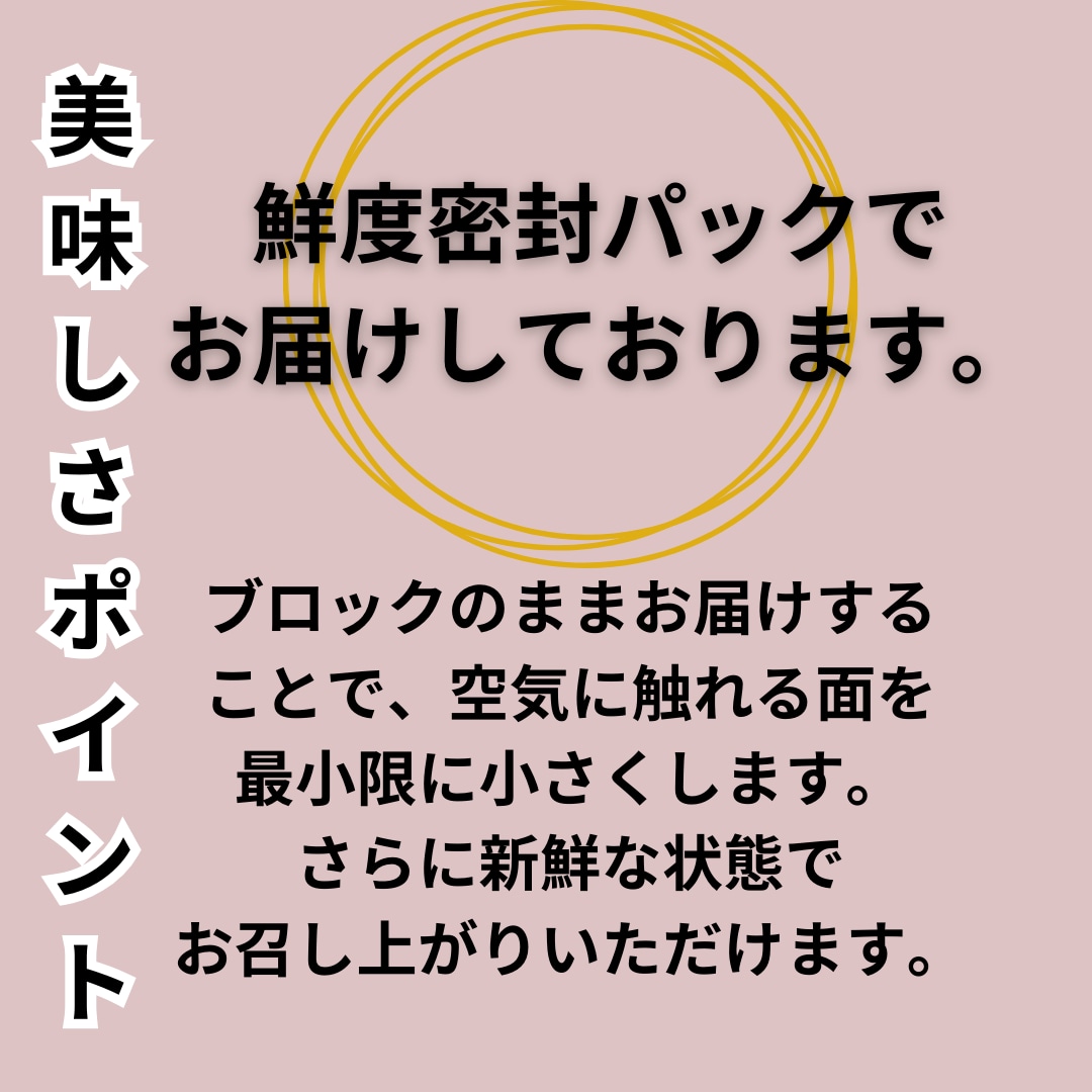 ブロックのままお届けすることで、空気に触れる面を最小限に小さくします。さらに新鮮な状態でお召し上がりいただけます。
