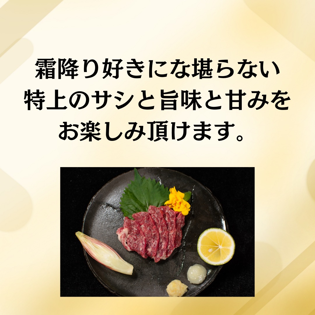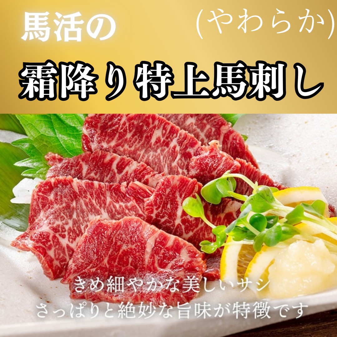 霜降り馬刺しの特上やわらかは、口に入れた瞬間に広がる濃厚な味わいが特徴。