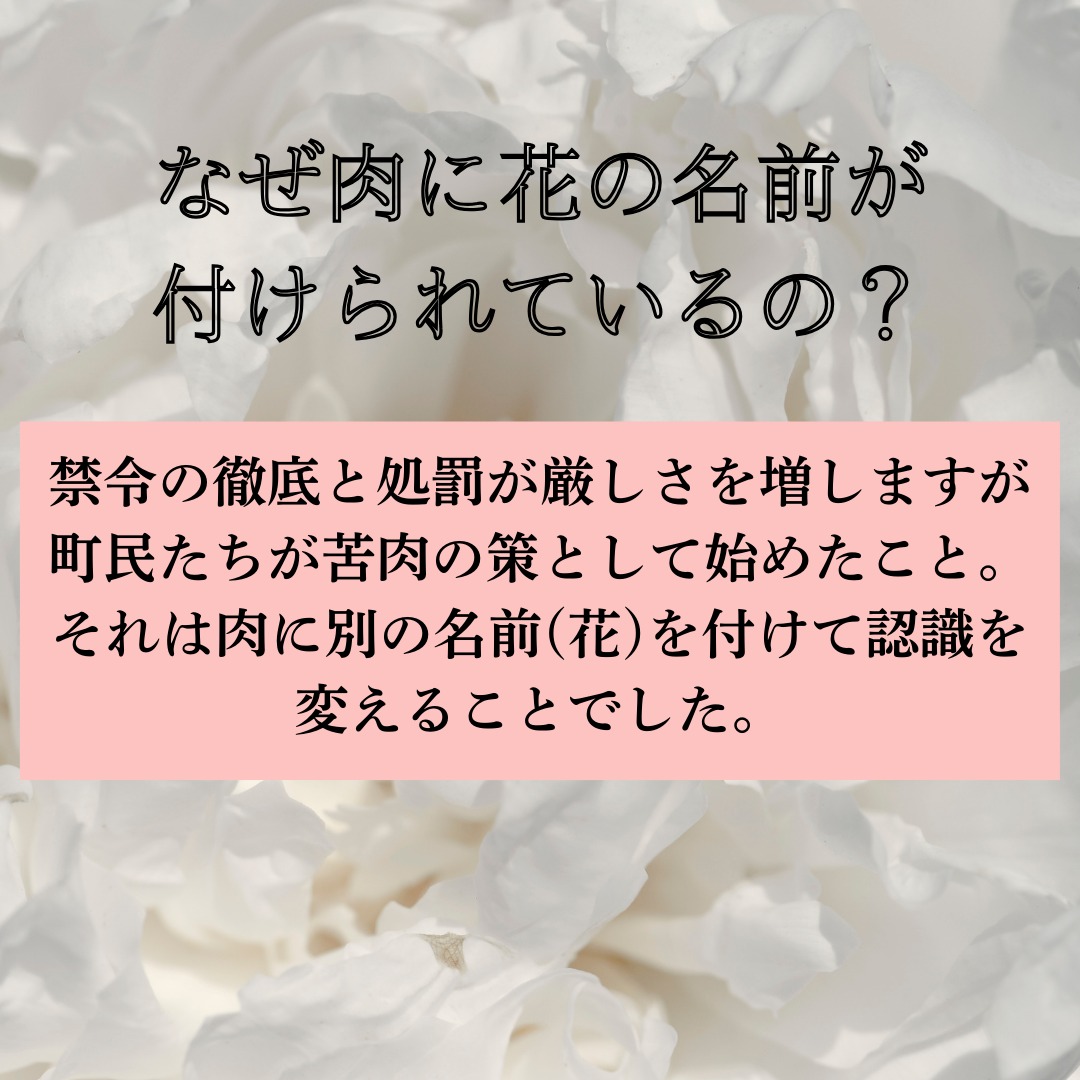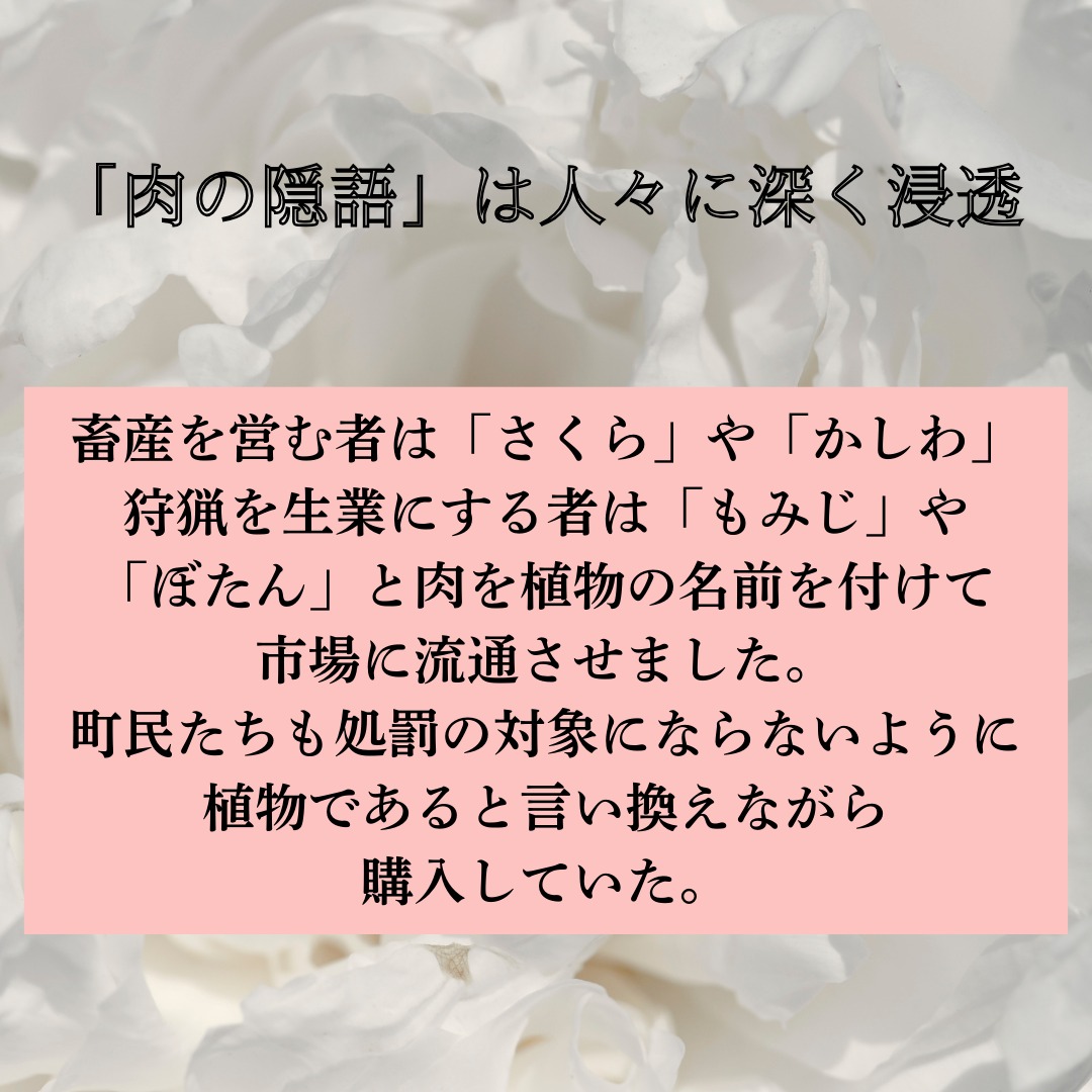 狩猟する者は「もみじ」や「ぼたん」という植物の名前でお肉を市場に流通させました。