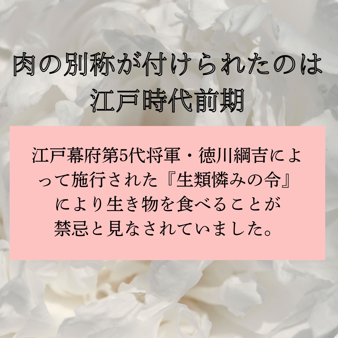 これらのお肉に別称がつけられたのは、今から約330年前の江戸時代のこと。