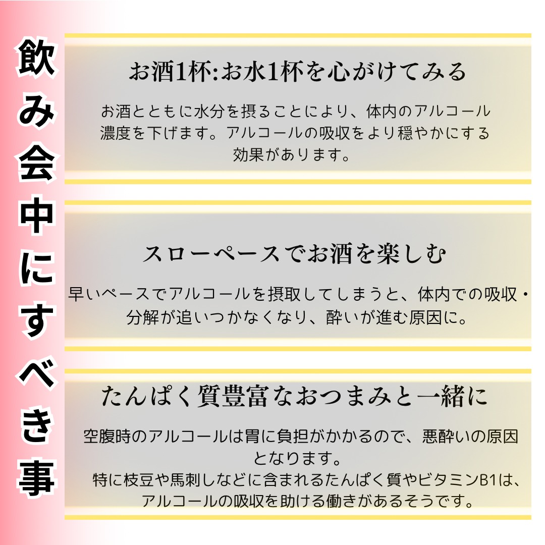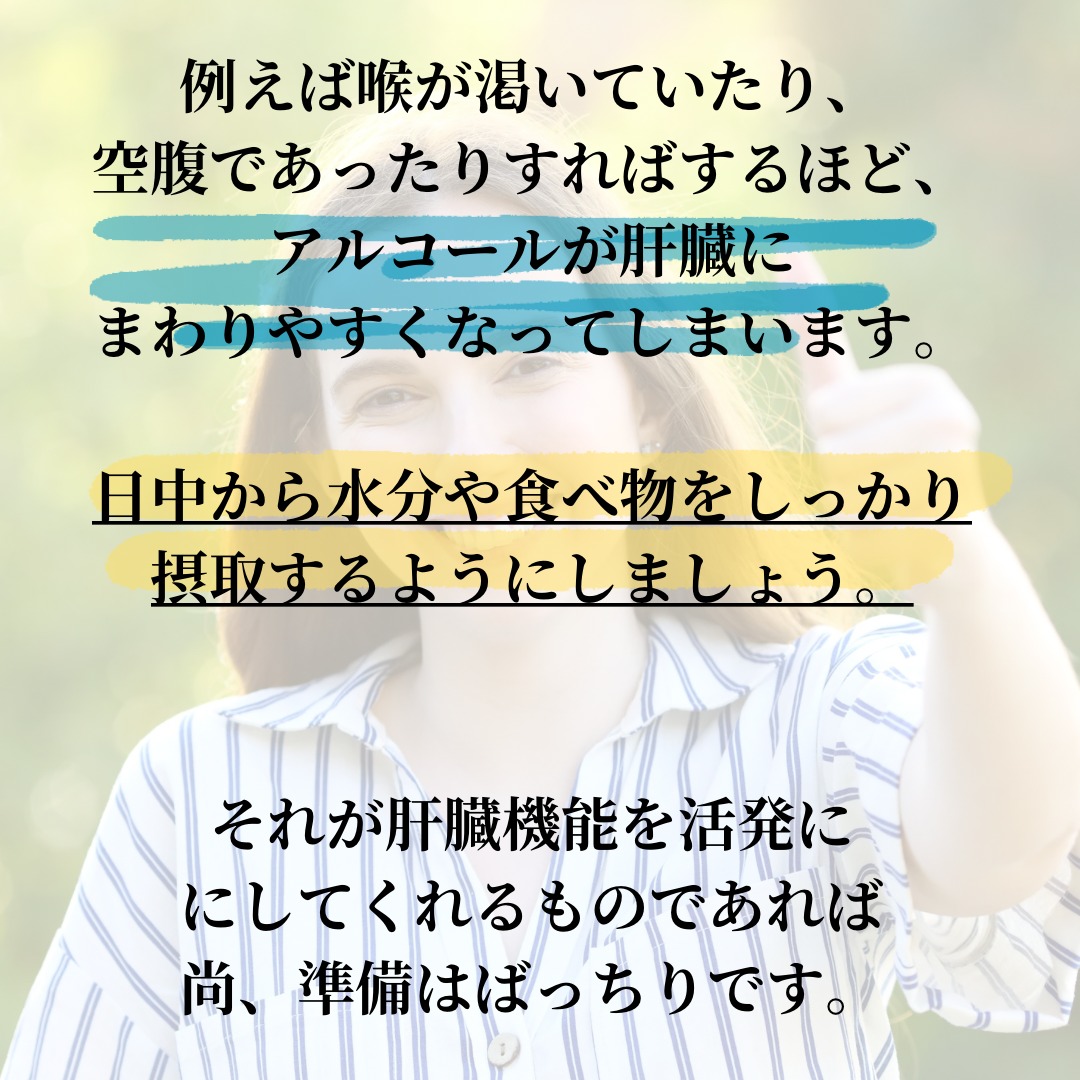 喉が渇いていたり、あるいは空腹であったりすればするほど、アルコールが肝臓へまわりやすいです。日中から水分や食べ物を意識してしっかり摂取するようにしてみると良さそうですね☺︎それが肝臓機能を活発にしてくれるものであれば、なおさら準備万端ですね✊🏻❤️🔥