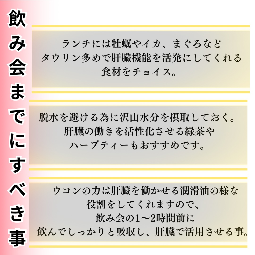 ・ウコンの力は飲み会の1~2時間前に飲んで吸収し、肝臓でしっかり活用させる必要がある