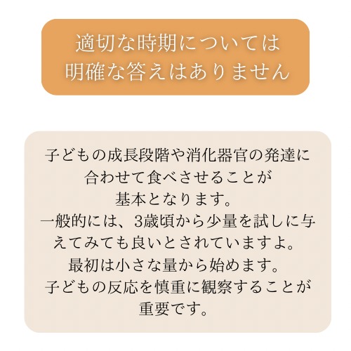 一般的には、3歳頃から少量を試しに与えてみても良いとされていますが、最初は小さな量から始め、子どもの反応を慎重に観察することが重要です。
