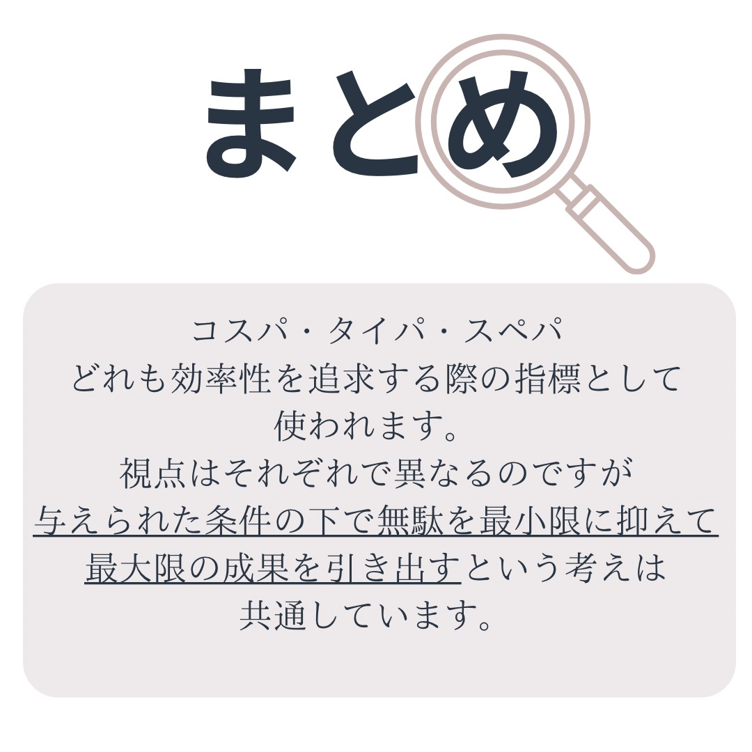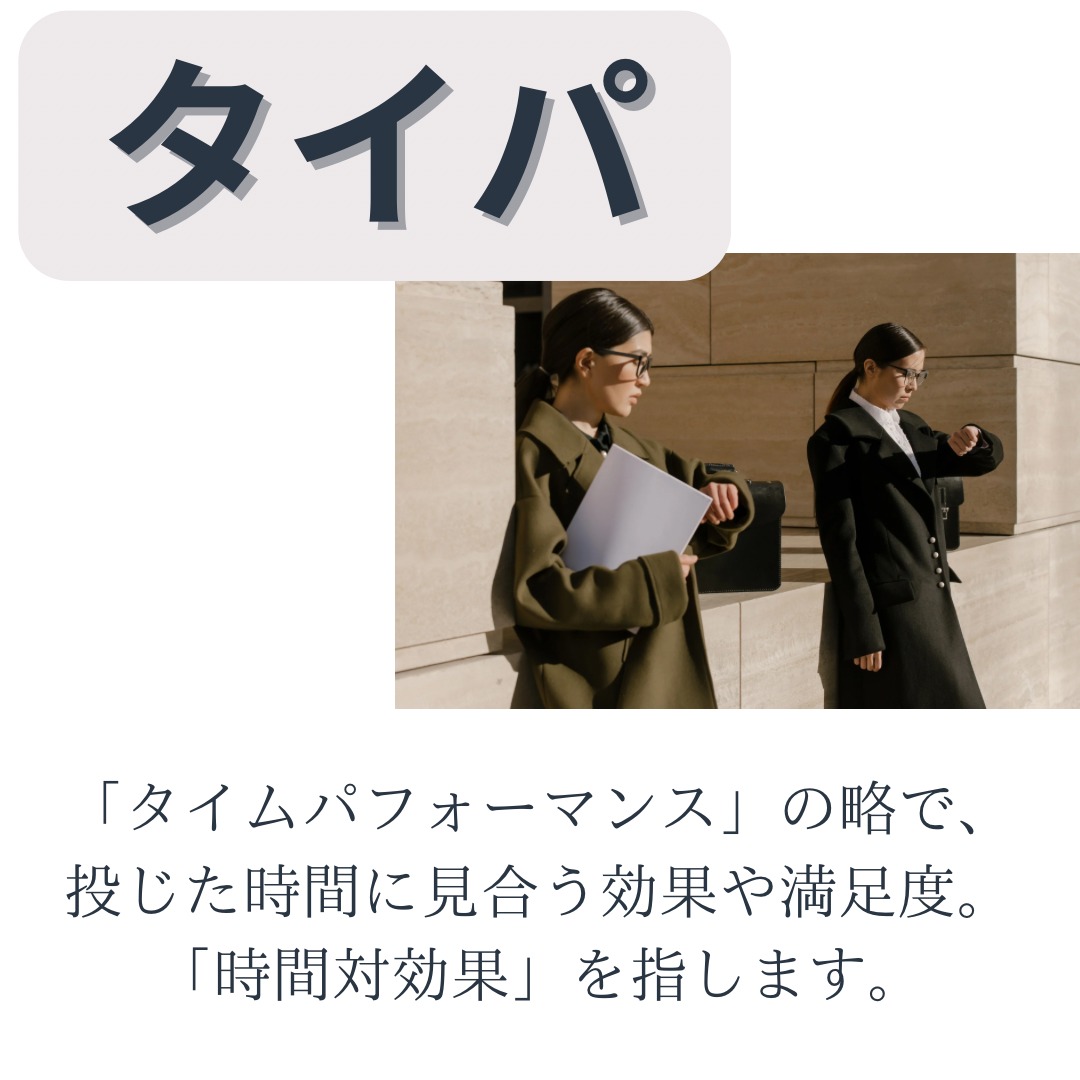 「コスパ」「タイパ」ですが「最小の労力や所要時間で、最大の効果を得る」といったニュアンスで使われることが多いように思います。
