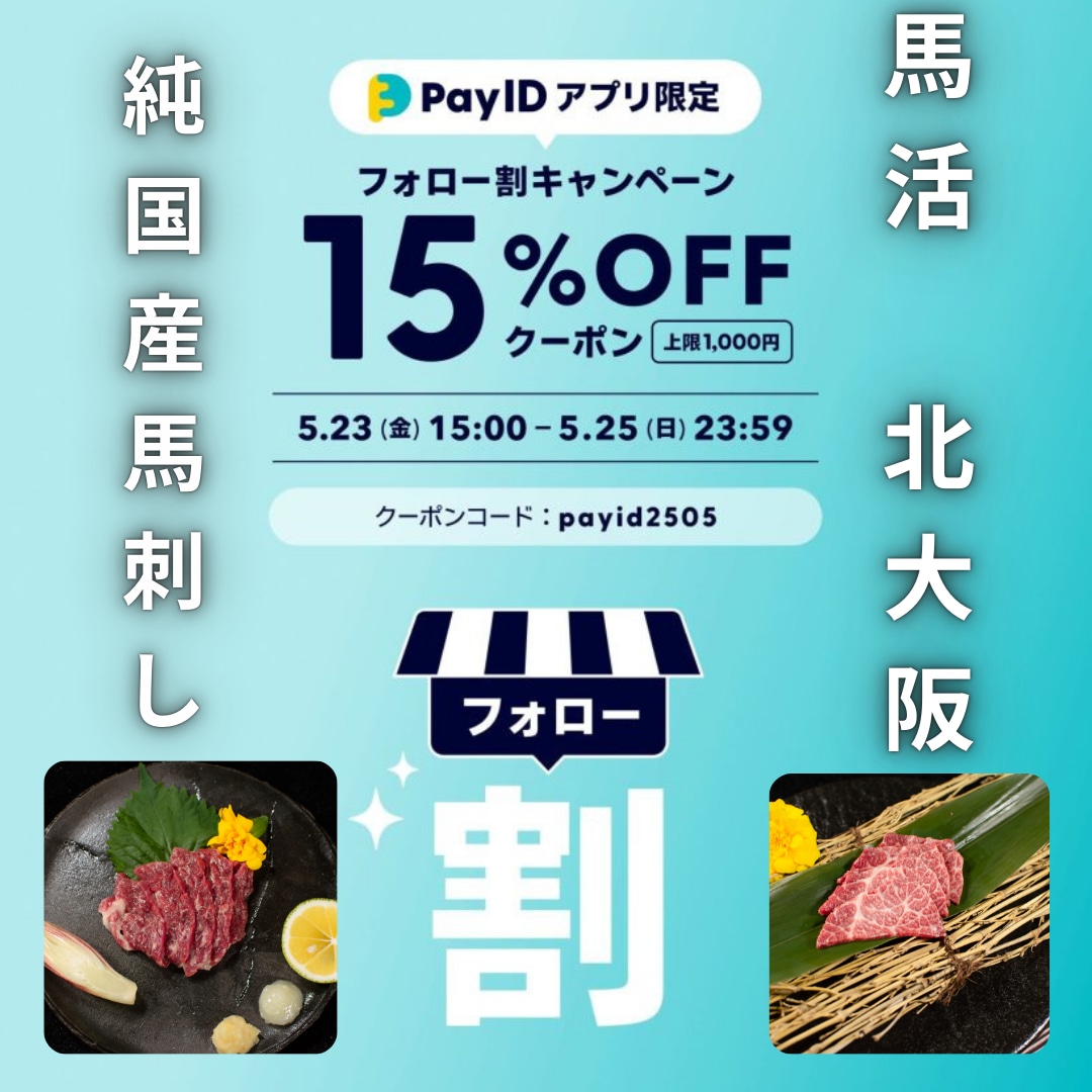 ショッピングアプリ「Pay ID」でのお買い物で、ショップ「馬活 北大阪」をフォローすれば